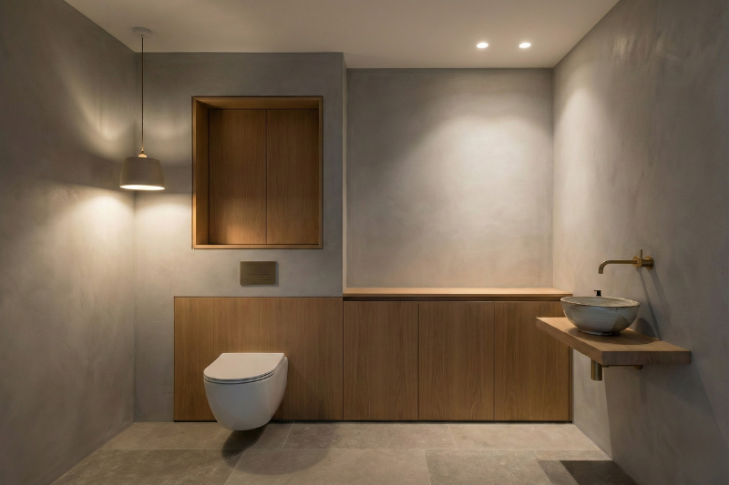 最近のトレンドは、少し暗めのトーン。落ち着きが出るだけでなく、白い便器や手洗いボウルが美しく際立ちます。照明を少し落とせば、まるでバーやホテルのような、静寂な空間に仕上がります。